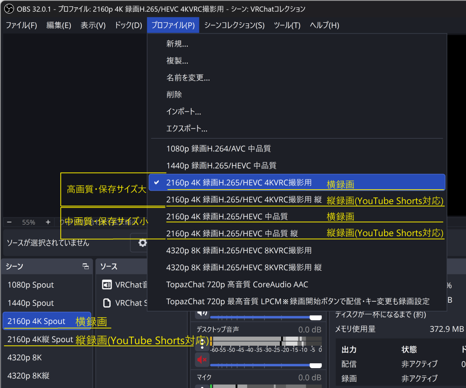OBS設定済みデータを使う事で、OBSの設定作業のほとんどをスキップ出来て、設定済みのプロファイルを目的に合わせて選択するだけで済みます。